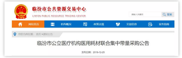 昨日(12月25日),山西省臨汾市公共資源交易中心發布《臨汾市公立醫療機構醫用耗材聯合集中帶量采購公告》(下稱《公告》)。