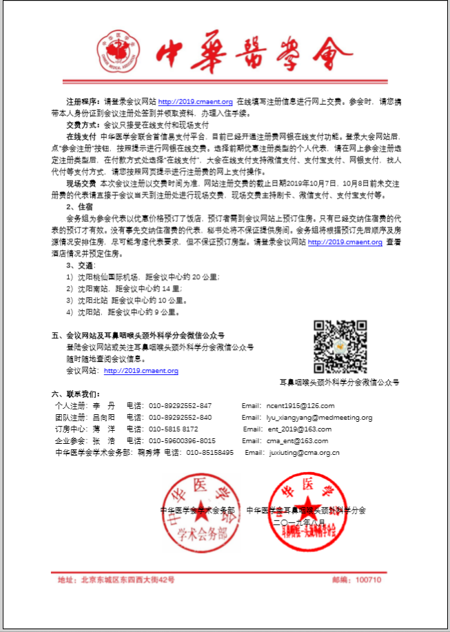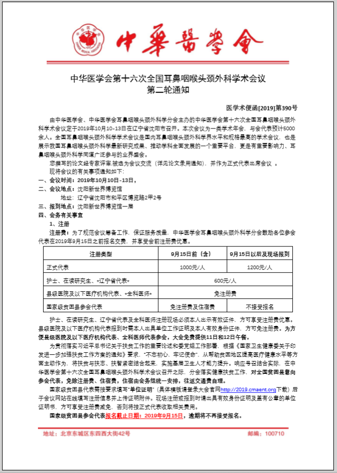 由中華醫學會、中華醫學會耳鼻咽喉頭頸外科學分會主辦的中華醫學會第十六次全國耳鼻咽喉頭頸外科學術會議定于2019年10月10-13日在遼寧省沈陽市召開。本次會議為一類學術年會,與會代表預計5000余人。全國耳鼻咽喉頭頸外科學學術會議是國內耳鼻咽喉頭頸外科學界水平和規格最高的學術會議,也是展示我國耳鼻咽喉頭頸外科學最新研究成果、推動學科全面發展的一個重要平臺,更是有重要影響力、耳鼻咽喉頭頸外科學同道廣泛參與的業界盛會。
