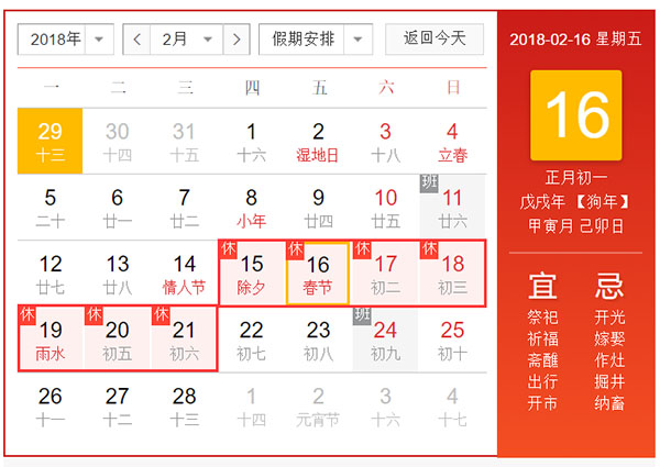 根據(jù)國家規(guī)定、北京華康普美科技有限公司2018年春節(jié)放假安排如下:2018年2月15日至2017年2月21日放假調(diào)休,共7天。春節(jié)前2月11日(星期日)正常上班,春節(jié)后2月24日(星期六)正常上班。