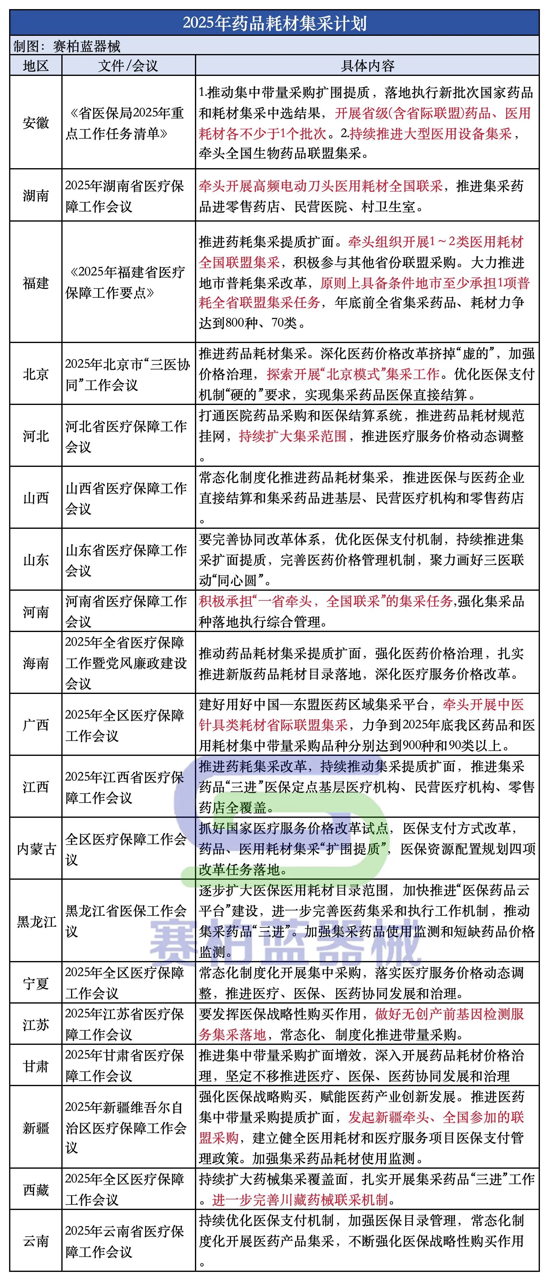 截止目前,全國大部分省份已召開2025年醫保工作會議,部分省份發布2025醫保工作要點。集采“提質擴面”被反復提及,新的耗材集采項目陸續公布。