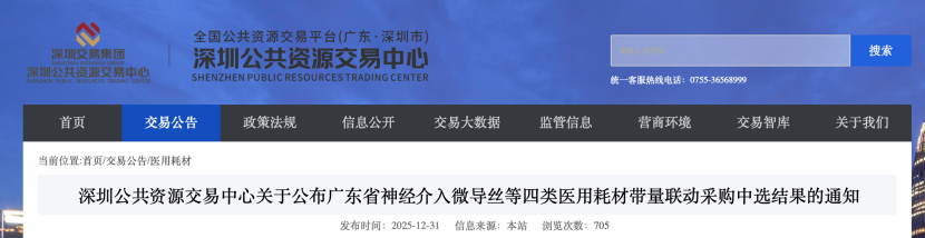 12月31日,深圳公共資源交易中心正式公布了廣東省神經介入微導絲等四類醫用耗材帶量聯動采購中選結果。