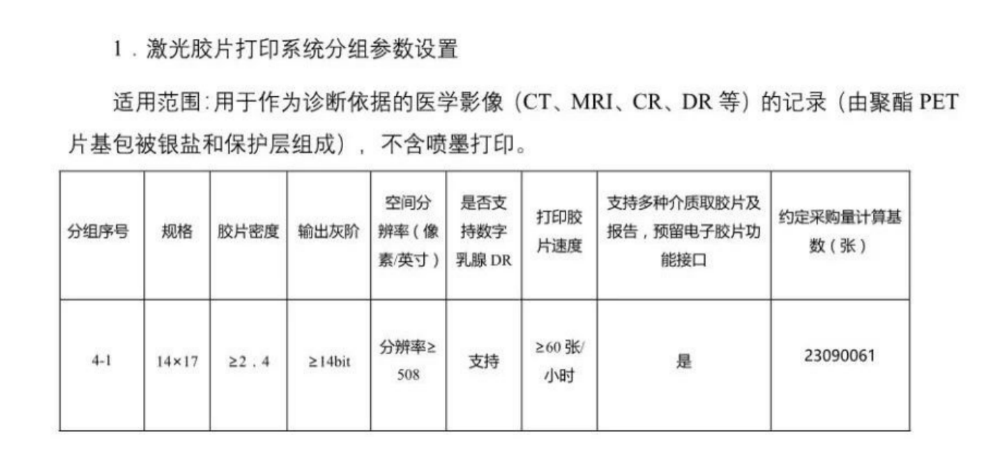 點評:對激光膠片的要求竟有六項之多,這是在以前的招標中前所未有,14*17的膠片是最常用的,CT和MRI必須用14*17的,DR可以用其他尺寸的,比如10*12,8*10。分辨率大于508的醫(yī)用膠片是高端產(chǎn)品,低于508dpi是低端產(chǎn)品。最重要的是含銀的醫(yī)用膠片都是進口的如銳柯,富士4000,柯尼卡,采用干式直熱成像技術(shù),而國產(chǎn)激光膠片主要是采用的激光轉(zhuǎn)印技術(shù)。噴墨膠片因為價格很低對進口膠片的威脅很大,搶占不少進口膠片的市場份額。