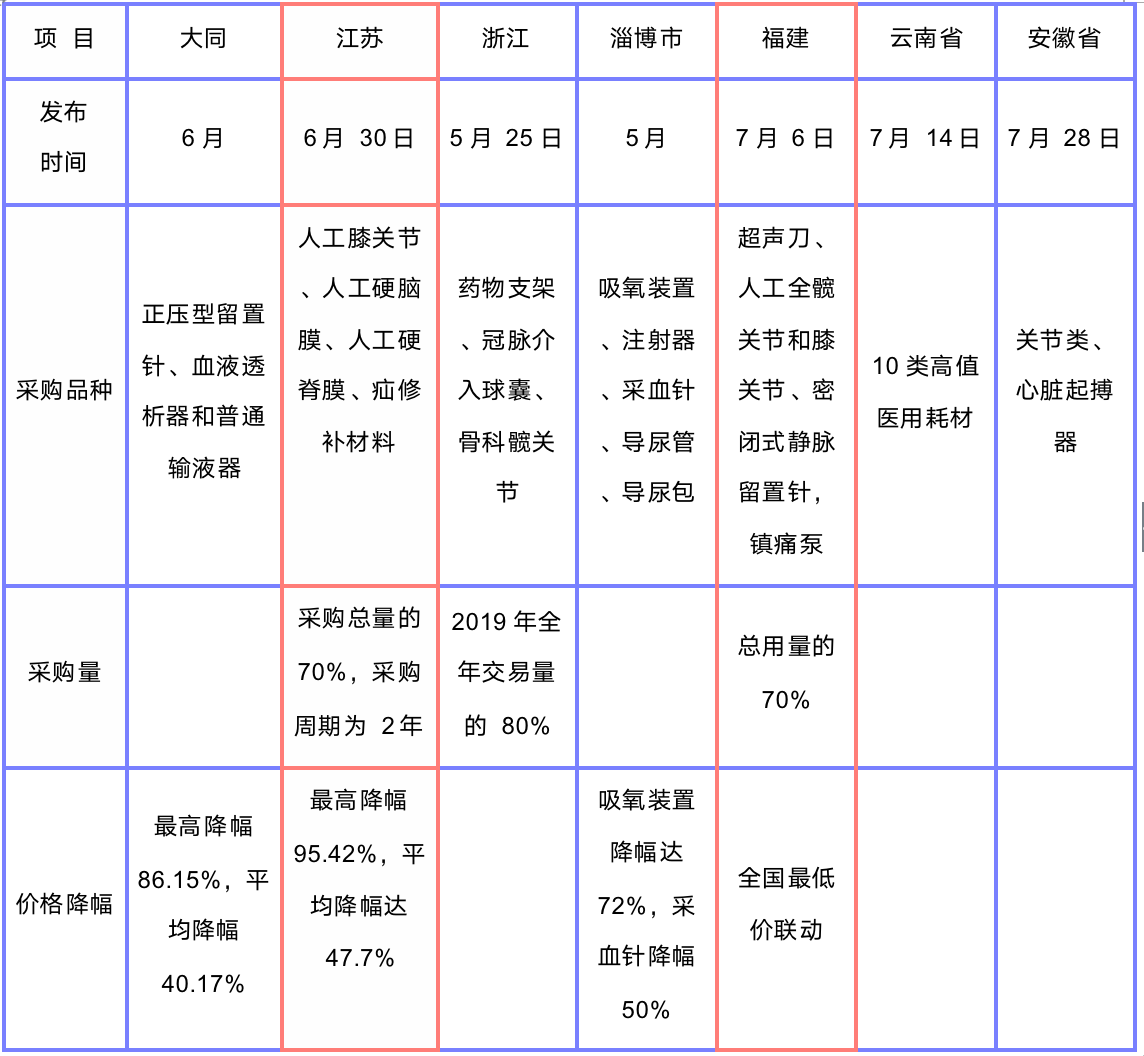 2020年3月中旬國家醫(yī)保局曾明確要求要在未來6個月內(nèi)(即9月中旬前),對11個試點省份(江蘇、安徽、福建、青海、上海、浙江、湖南、重慶、四川、陜西和寧夏)開展高值耗材帶量采購工作,其余23個省份及城市也要積極跟進。