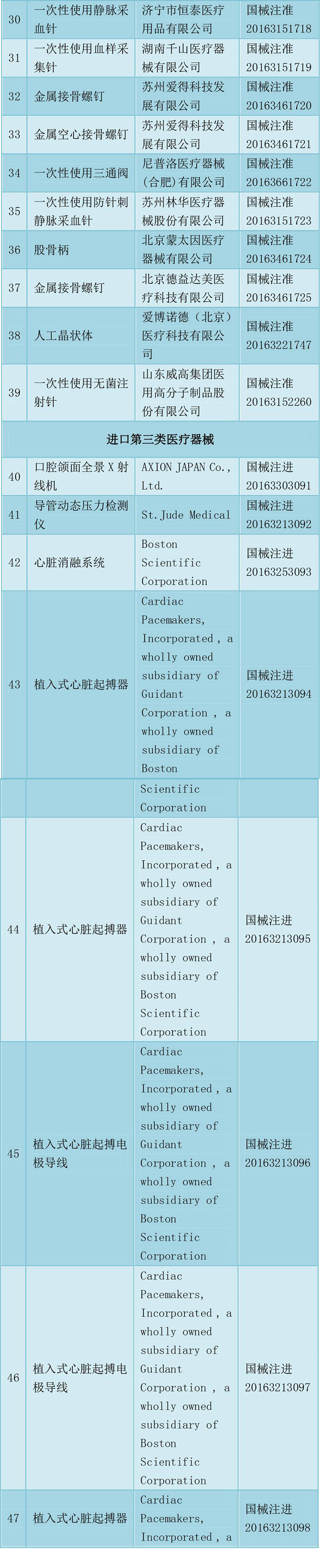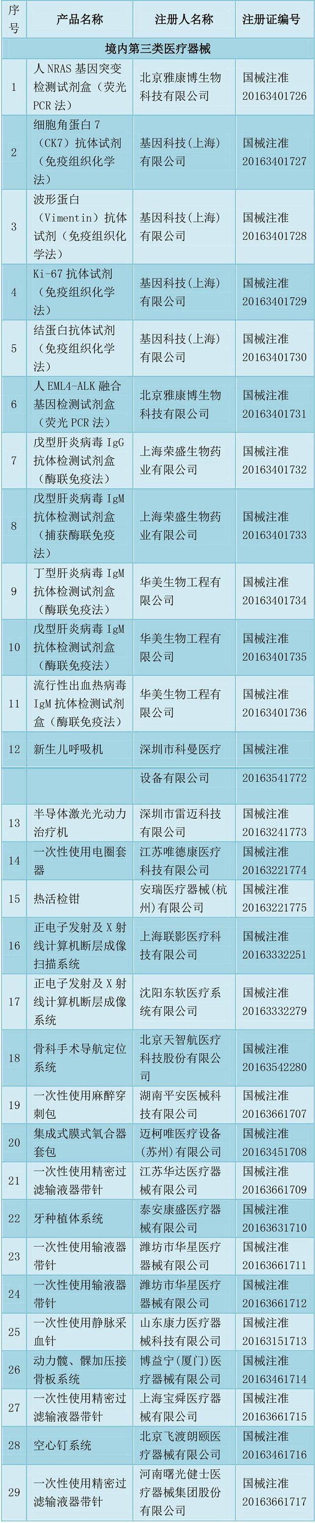 2016年11月批準注冊醫療器械產品目錄