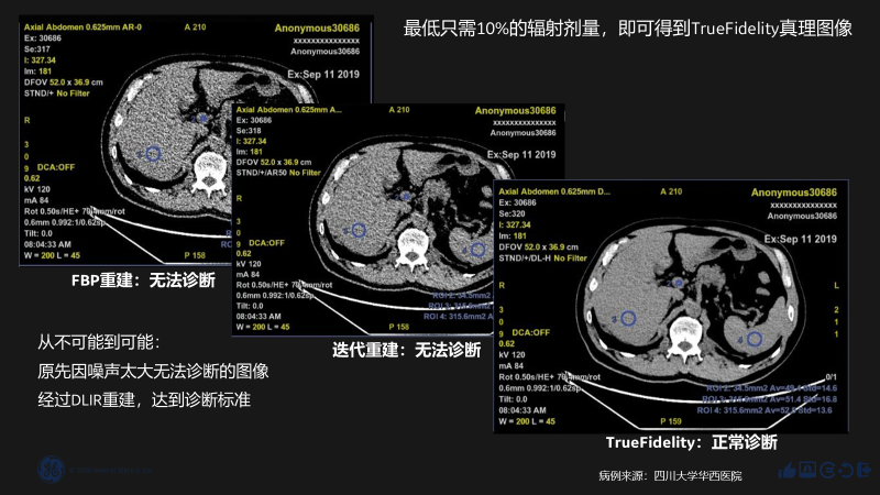 在四川大學(xué)華西醫(yī)院提供的臨床測試中,應(yīng)用了TrueFidelity的圖像下完全達(dá)到了常規(guī)的診斷標(biāo)準(zhǔn),解決了超低劑量CT掃描導(dǎo)致的噪聲太大無法診斷的問題,且最低只需10%的輻射劑量,就得到了TrueFidelity真理圖像。