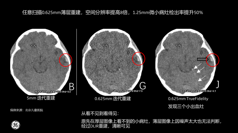 北京兒童醫(yī)院的測試病例也顯示,經(jīng)過TrueFidelity,任意掃描0.625mm薄層重建,空間分辨率能提高8倍,1.25mm微小病灶檢出率提升50%,最終額外發(fā)現(xiàn)了3個(gè)之前看不到的微小病灶。