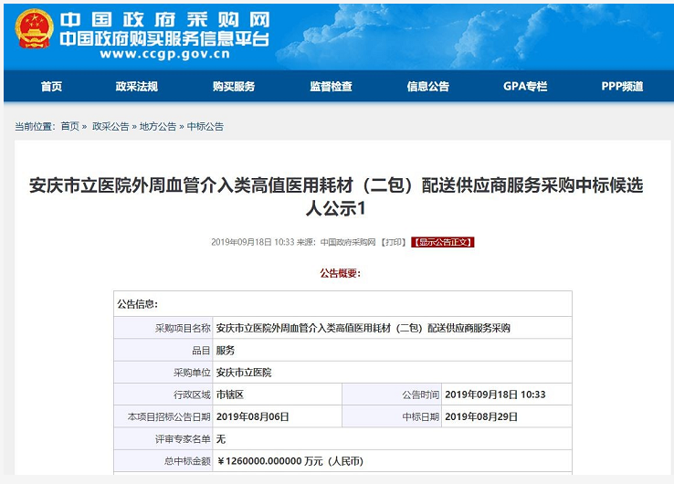 9月18日中國政府采購網發布《安慶市立醫院外周血管介入類高值醫用耗材(二包)配送供應商服務采購中標候選人公示1》。