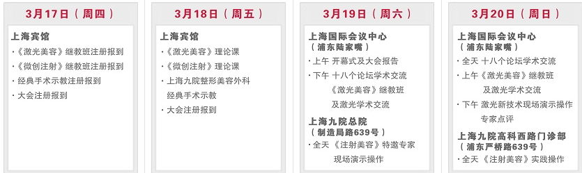 顱頜面專業論壇、顯微修復重建專業論壇、手外科專業論壇、眼整形專業論壇、鼻整形專業論壇、耳整形專業論壇、乳房整形美容專業論壇、瘢痕治療專業論壇、脂肪整形美容專業論壇、微創與抗衰老專業論壇、血管瘤專業論壇、淋巴水腫專業論壇、生殖整形專業論壇、面癱修復專業論壇、毛發移植專業論壇、醫美管理專業論壇、青年學者研究論壇、整形美容護理專業論壇、《現代激光技術在皮膚美容方面的應用研究》繼教班、《微創注射美容技術新進展》繼教班將集中展示上海九院整體學科發展水平,并以更專業化的視點匯集國內外最權威的專家學者,交流最前沿的資訊與理論,分享最有價值的臨床經驗與技術。
