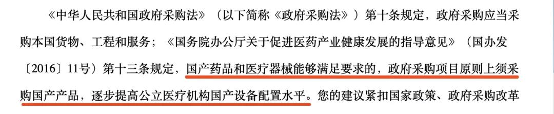 《中華人民共和國(guó)政府采購(gòu)法》(以下簡(jiǎn)稱《政府采購(gòu)法》)第十條規(guī)定,政府采購(gòu)應(yīng)當(dāng)采購(gòu)本國(guó)貨物、工程和服務(wù);《國(guó)務(wù)院辦公廳關(guān)于促進(jìn)醫(yī)藥產(chǎn)業(yè)健康發(fā)展的指導(dǎo)意見》(國(guó)辦發(fā)〔2016〕11號(hào))第十三條規(guī)定,國(guó)產(chǎn)藥品和醫(yī)療器械能夠滿足要求的,政府采購(gòu)項(xiàng)目原則上須采購(gòu)國(guó)產(chǎn)產(chǎn)品,逐步提高公立醫(yī)療機(jī)構(gòu)國(guó)產(chǎn)設(shè)備配置水平。