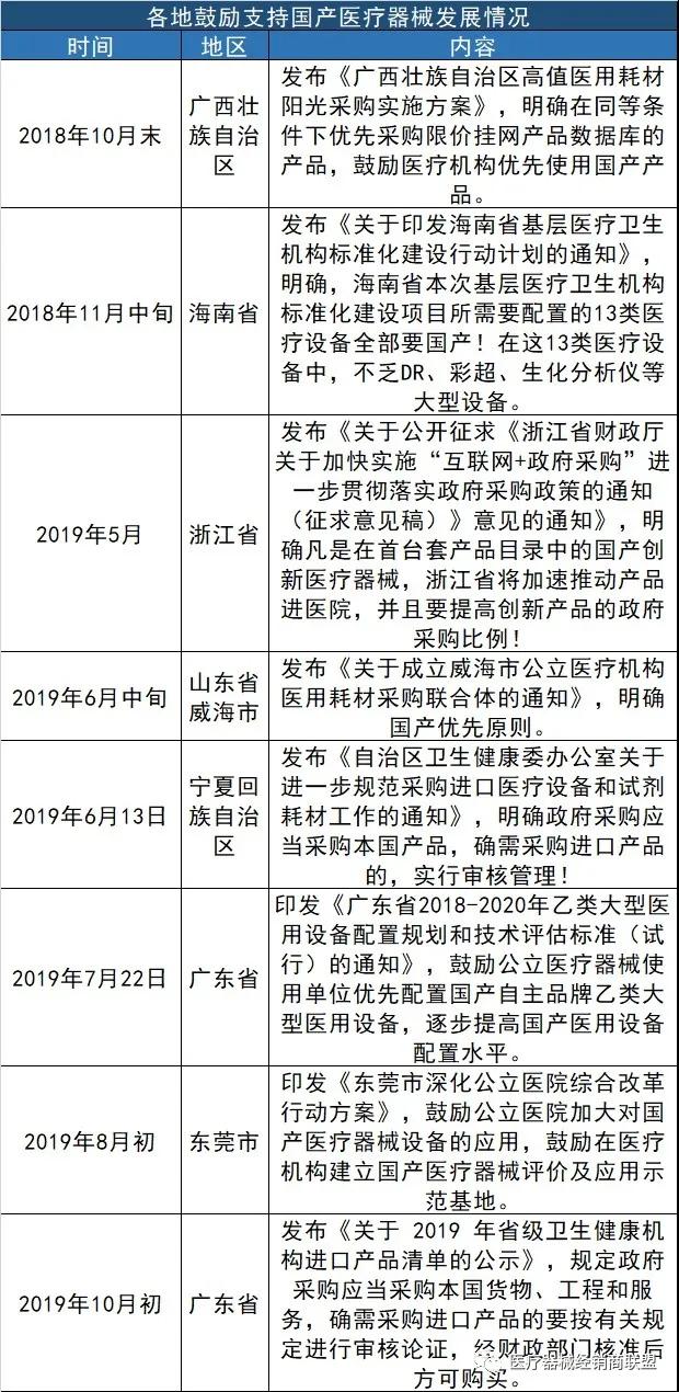 近幾年全國(guó)對(duì)于支持國(guó)產(chǎn)的呼聲達(dá)到了頂峰,作為長(zhǎng)期被進(jìn)口品牌壟斷的醫(yī)療器械行業(yè),也成為了國(guó)家推進(jìn)國(guó)產(chǎn)產(chǎn)品的一個(gè)重點(diǎn)領(lǐng)域。各省在允許采購(gòu)進(jìn)口醫(yī)療產(chǎn)品方面加大限制,在國(guó)產(chǎn)產(chǎn)品能夠達(dá)到同等要求的情況下,堅(jiān)決優(yōu)先采購(gòu)國(guó)產(chǎn)。