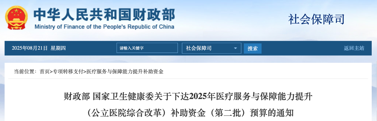 8月20日,財政部發布《財政部國家衛生健康委關于下達2025年醫療服務與保障能力提升(公立醫院綜合改革)補助資金(第二批)預算的通知》。