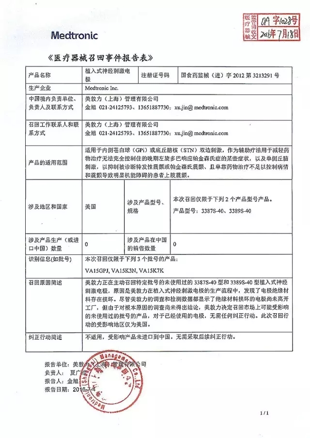 美敦力(上海)管理有限公司報告,該公司代理的植入式神經刺激電極(注冊證編號:國食藥監械(進)字2012第3213291號),由于在生產流程中發現了電極絕緣材料存在損壞,其生產商Medtronic Inc.對該產品進行主動召回。該公司稱本次召回產品未在中國銷售。請各省、自治區、直轄市食品藥品監督管理局加強對此類產品的監督管理。
