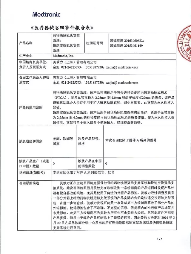 美敦力(上海)管理有限公司報告,該公司代理的藥物洗脫冠脈支架系統(注冊證編號:國械注進20163460682)和快速交換冠脈支架系統(注冊證編號:國械注進20153461149),由于部分產品可能貼上了錯誤的標簽,其生產商Medtronic Inc.對該產品進行主動召回。該公司稱本次召回產品未在中國銷售。請各省、自治區、直轄市食品藥品監督管理局加強對此類產品的監督管理。