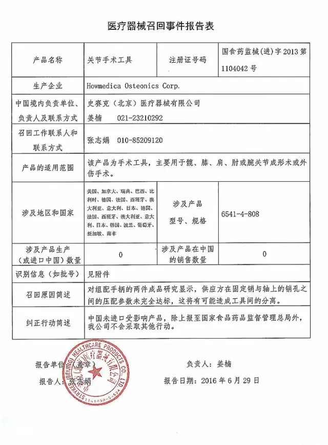 史賽克(北京)醫療器械有限公司報告,該公司代理的關節手術工具(注冊證編號:國食藥監械(進)字2013第1104042號),由于在固定銷與軸上的銷孔之間的壓配參數未完全達標,這將有可能造成工具間的分離,其生產商Howmedica Osteonics Corp.對該產品進行主動召回。該公司稱本次召回產品未在中國銷售,請各省、自治區、直轄市食品藥品監督管理局加強對此類產品的監督管理。