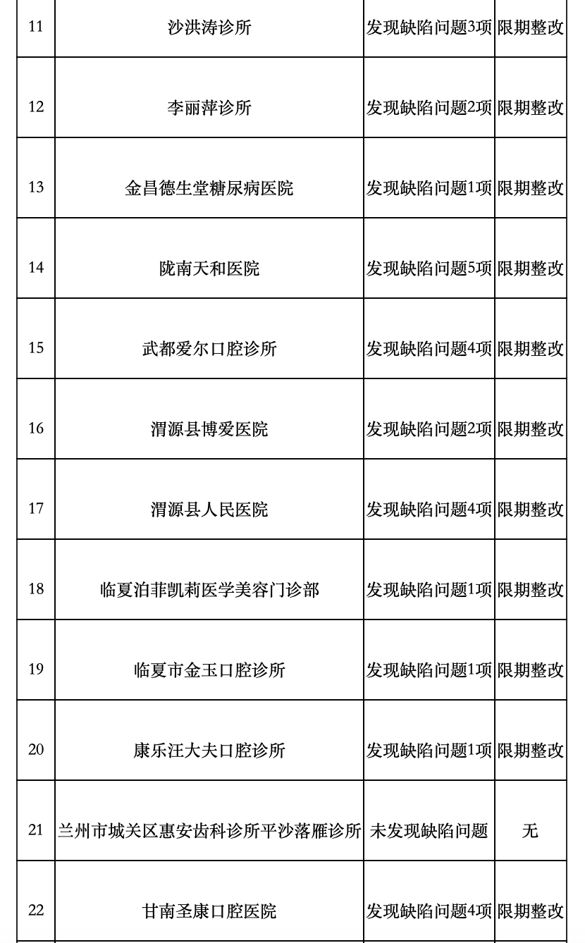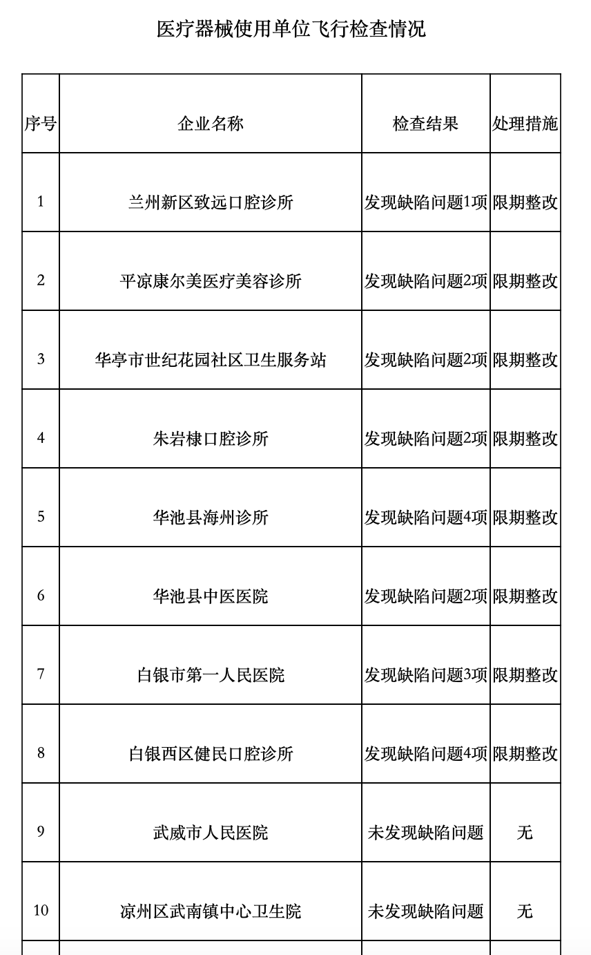 12月11日, 甘肅省藥品監督管理局網站發布的《關于2020年度部分醫療器械使用單位飛行檢查情況的通告》顯示,根據《醫療器械監督管理條例》《醫療器械使用質量監督管理辦法》等法規、規章規定,2020年11月16日-11月25日,甘肅省藥品監督管理局組織檢查組對省內部分醫療器械使用單位進行了飛行檢查。