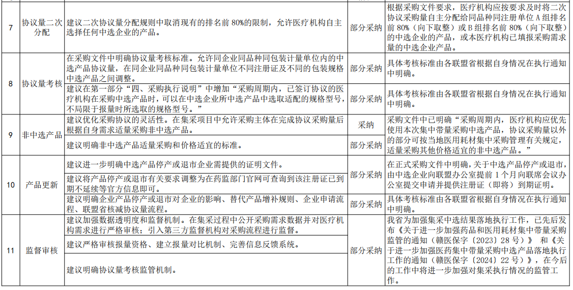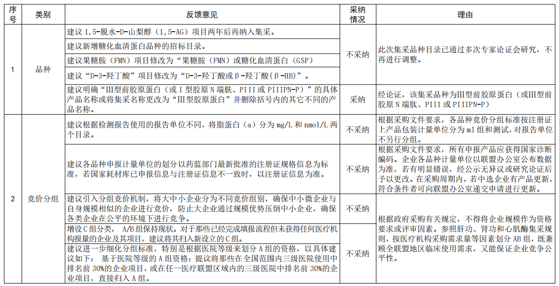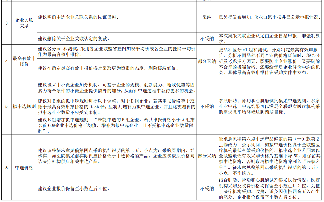 同時,在擬中選規(guī)則中“設立中小微企業(yè)加分機制”“B組低價增補”等建議也均被駁回,官方回應的理由為:參照肝功、腎功和心肌酶試劑集采中選規(guī)則,多家企業(yè)中選,中選結果可以滿足全聯(lián)盟省醫(yī)療機構采購需求且平均降幅達到預期目標。