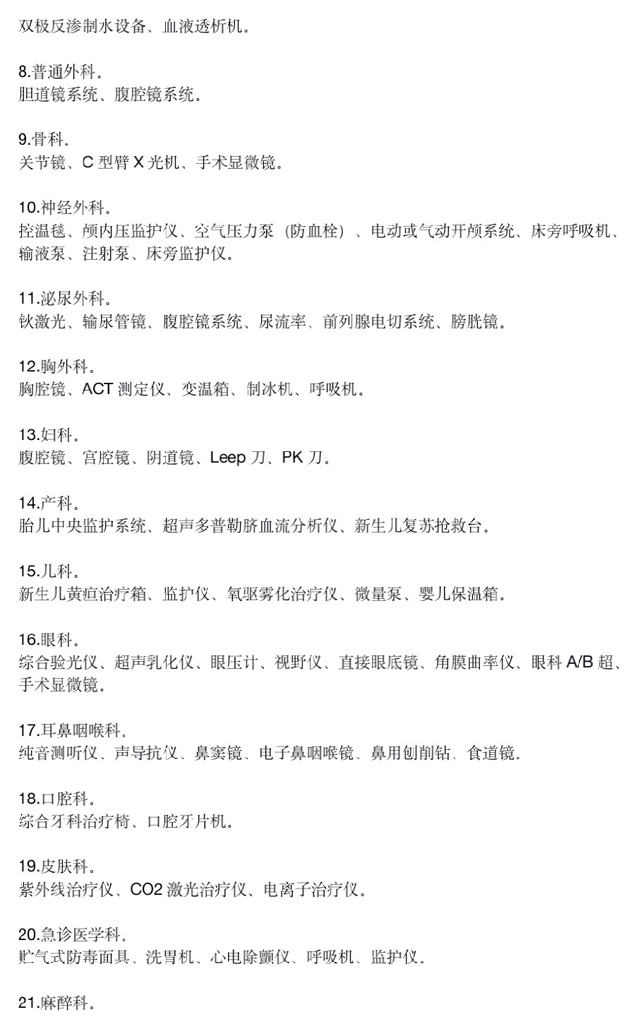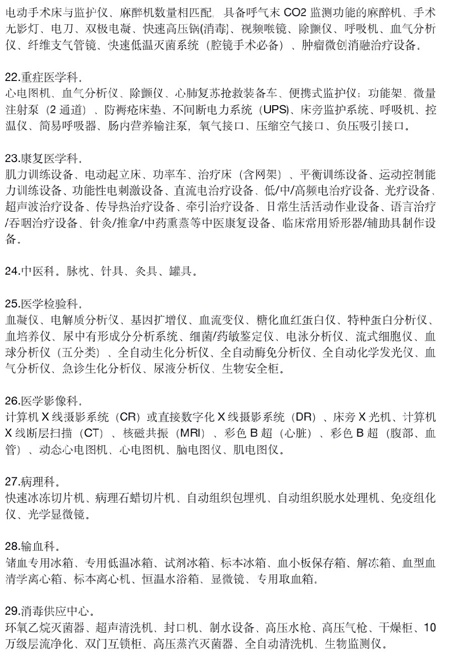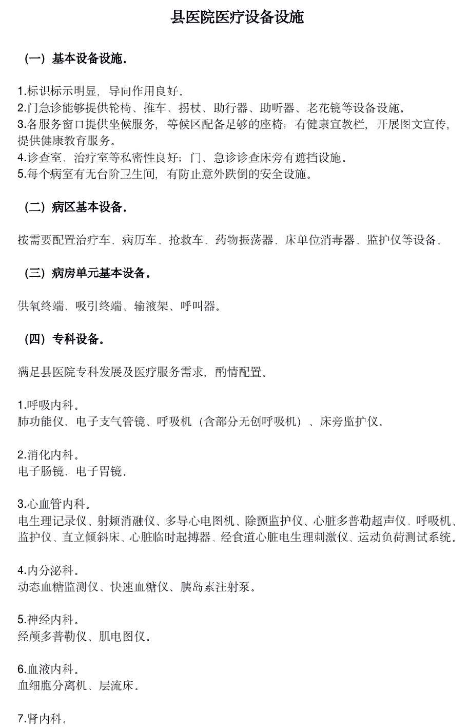 設備配置方面,《方案》還特別提到,要逐步改善硬件設施設備條件,結合專科發展需求,系統完善發熱門診、急診醫學科、住院部、醫技科室等業務用房條件,加快數字健康基礎設施建設,改善醫療、信息化等設備和醫用車輛配置,改善停車、醫用織物洗滌、醫療廢物和污水處理等后勤保障設施。