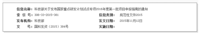 重點專項,是國家重點研發(fā)計劃組織實施的載體,受到國家的高度重視。按照國發(fā)64號文件關(guān)于先期啟動5-10個試點專項的要求,科技部、財政部、發(fā)改委會同相關(guān)部門凝練形成了“干細胞及轉(zhuǎn)化研究”、“數(shù)字診療裝備研發(fā)”、“大氣污染成因與控制技術(shù)研究”、“新能源汽車”、“化學肥料和農(nóng)藥減施增效綜合技術(shù)研發(fā)”、“七大農(nóng)作物育種”6個試點專項。