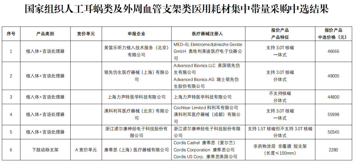 本次集采人工耳蝸類耗材需求量共1.1萬套,5家企業中選,包括奧地利美迪醫療、美國領先仿生、澳大利亞科利耳等外資企業,以及上海力聲特、浙江諾爾康等內資企業。