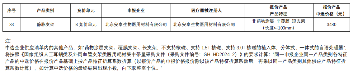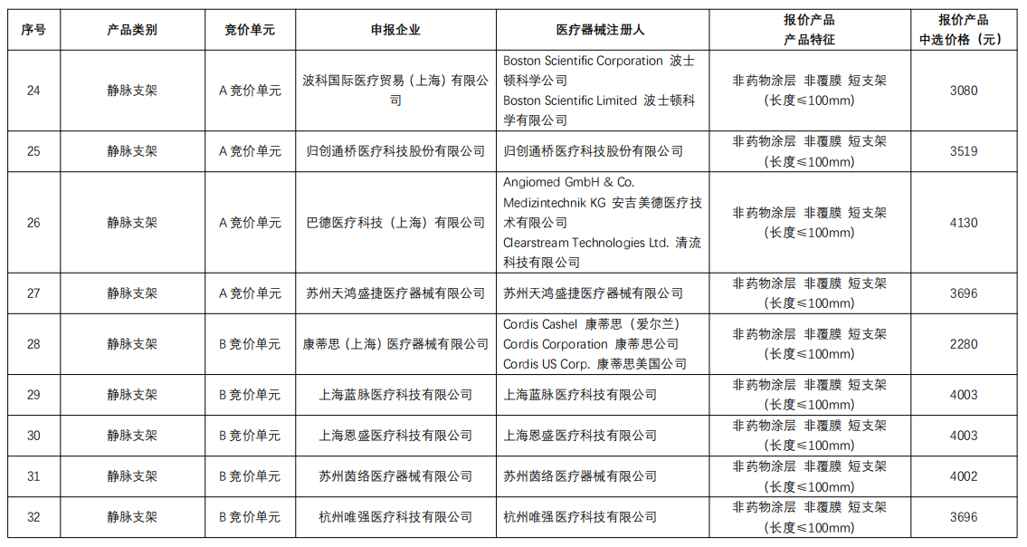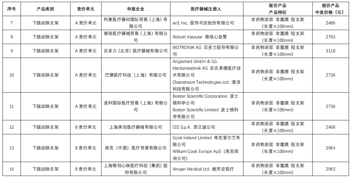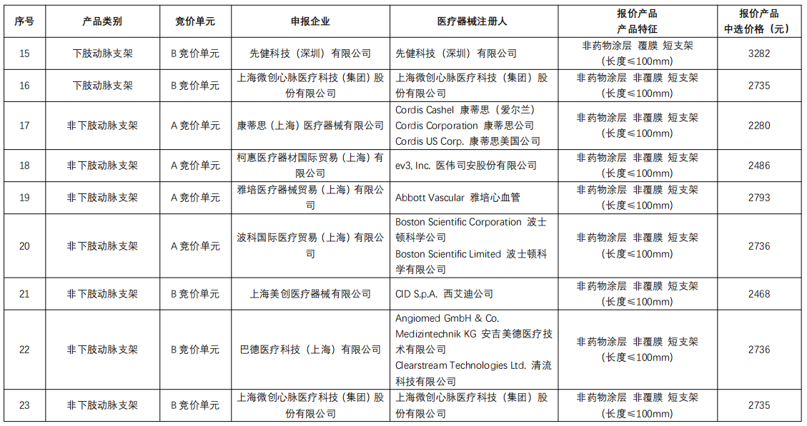 下肢動脈支架:庫克醫療、維芮安醫療通過規則二中選,巴德醫療、波科、先鋒科技、心脈醫療通過規則三中選;非下肢動脈支架:巴德醫療通過規則二中選,波科、心脈醫療通過規則三中選;靜脈支架:藍脈醫療、恩盛醫療、茵絡醫療通過規則二中選,天鴻盛捷、唯強醫療、安泰生物規則三中選。