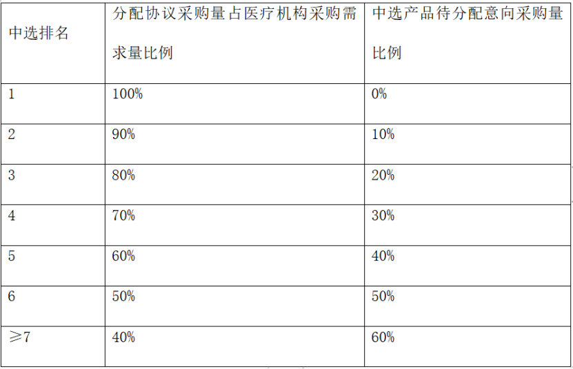 醫(yī)院填報了采購需求量但未中選的企業(yè)產品采購需求量、中選產品待分配意向采購量及申報價格高于醫(yī)療機構現(xiàn)行實際采購價格的企業(yè)需求量合并為醫(yī)療機構的待分配總量,醫(yī)療機構的待分配總量可自主分配給中選產品中價格適宜的產品,但分配給第1名的待分配總量不得小于中選企業(yè)平均分配比例,即:如5家企業(yè)中選,則第1名得到待分配總量的比例不得小于20%,申報價格高于醫(yī)療機構現(xiàn)行實際采購價格的企業(yè)除外。