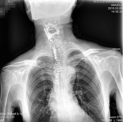 如下圖所示:該患者因吞咽時感到很難受,進食時也經常咳嗽故就醫診斷。華西醫院醫生使用動態DR為病人進行消化道造影診斷,要求他吞鋇后發現,食道各段通過順利,形態規則,雙側梨狀窩不對稱左側稍淺,多次吞咽動作后,仍見鋇劑滯留,并見鋇劑進入氣管,屬于會厭征陽性。會厭功能紊亂,鋇劑進入了氣管。