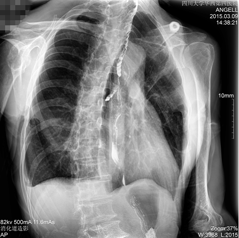 圖為斜位:通過動態影像可以清楚看到鋇劑進入了支氣管道