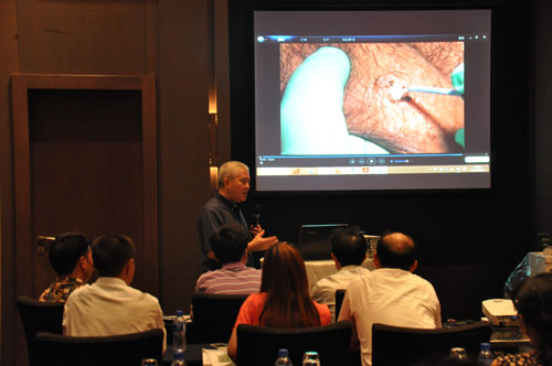 (圖為ellman國際大中華區營銷總監凌蔚翔先生講解ellman皮膚科射頻機知識)