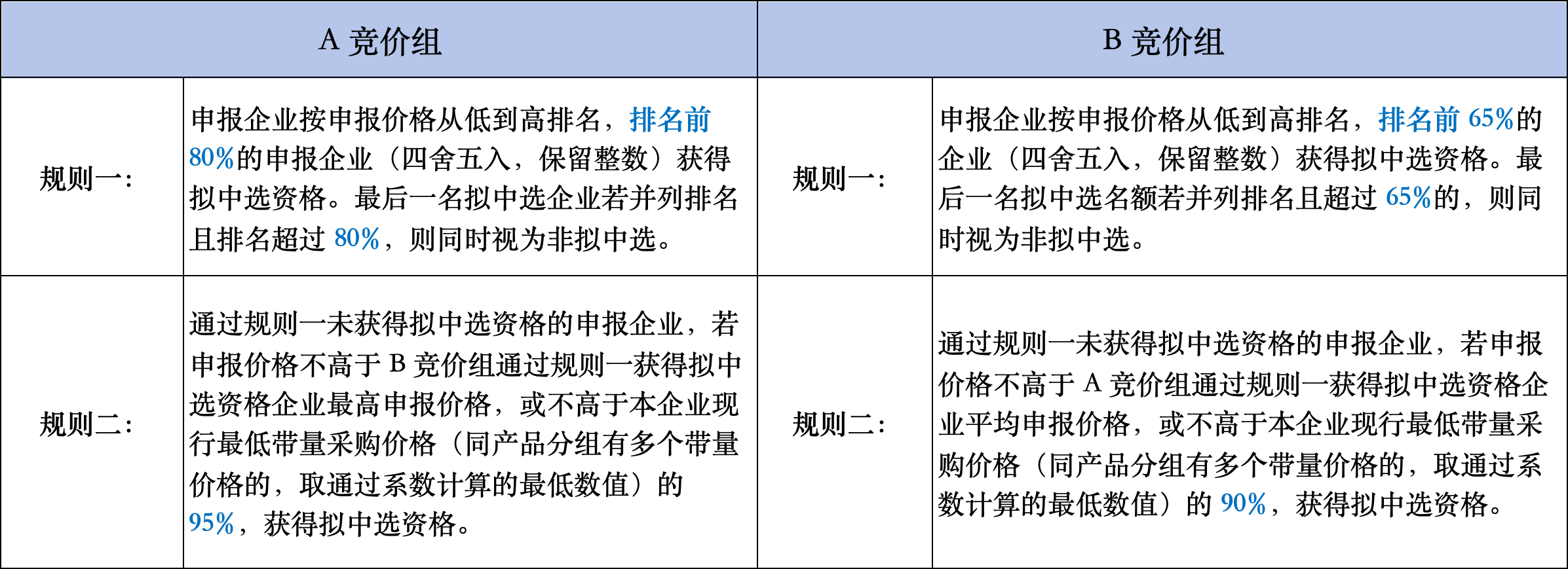此次共設置4個擬中選規則,其中規則一、二為中選規則。同一產品組中,若申報企業擬中選,則申報企業在該產品分組的所有產品均為擬中選。具體如下: