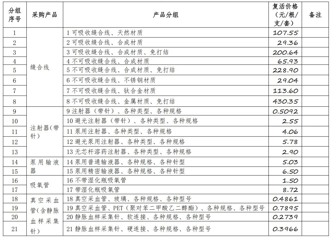 上文提到調整最高限價的兩類產品,其對應的復活價格也進行了調整。“可吸收縫合線、天然材質”的從73.83元調至107.55元;“不可吸收縫合線、合成材質”從40.73元調至65.93元。
