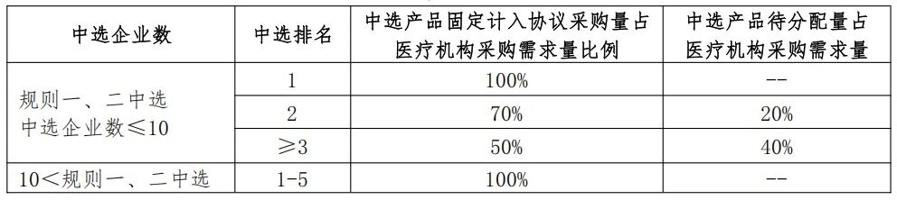 規則四為申報企業進一步托底,通過規則一、二、三均未獲得擬中選資格的申報企業,若申報價格不高于最高有效申報價格,復活為擬中選企業,只是在分量上居于末席。在保障企業中選的同時,也并未喪失集采擠出虛高價格水分的初心。