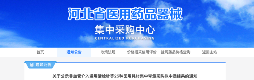 3月2日,河北省醫用藥品器械集中采購中心發布《關于公示非血管介入通用活檢針等25種醫用耗材集中帶量采購擬中選結果的通知》。