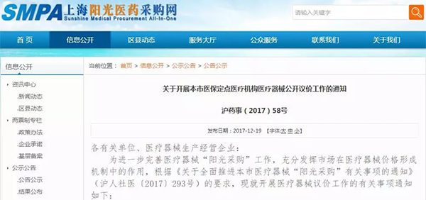 12月19日,上海陽光醫藥采購網發布《關于開展本市醫保定點醫療機構醫療器械公開議價工作的通知》(以下簡稱《通知》),明確“公開議價”的流程,是醫療機構發起議價,終端企業確認價格,雙方自主議定的結果即為采購價。該價格僅對本醫療機構有效。