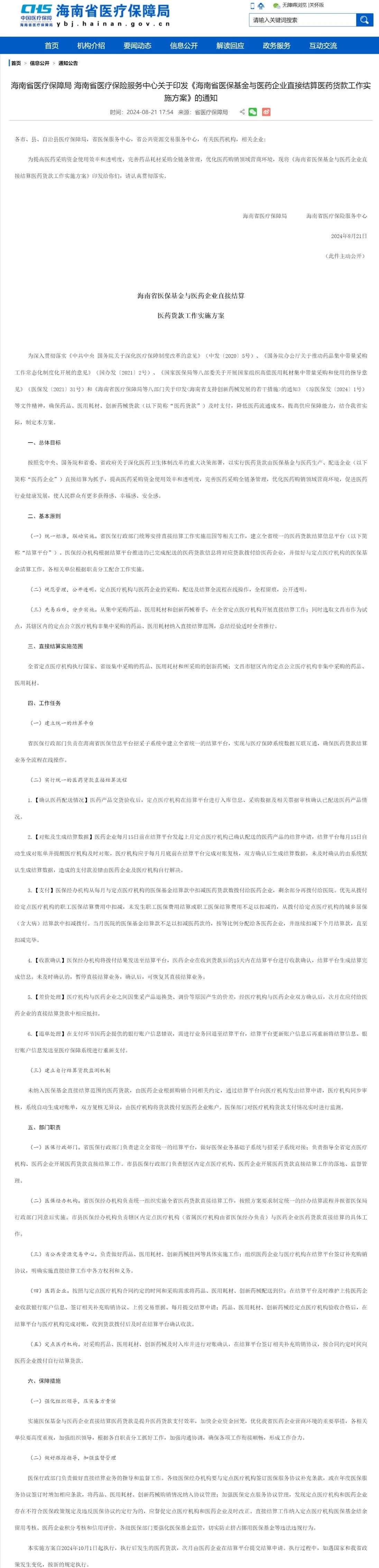 8月21日,海南醫(yī)保局發(fā)布《海南省醫(yī)?;鹋c醫(yī)藥企業(yè)直接結(jié)算醫(yī)藥貨款工作實(shí)施方案》(完整見文末)。