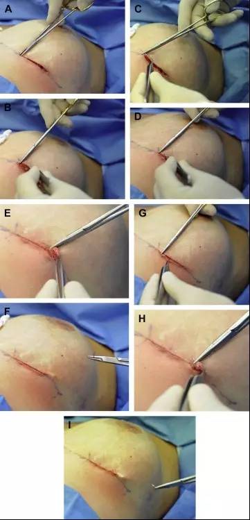 圖 2 A~I 示倒刺縫線應用于假體隆乳術