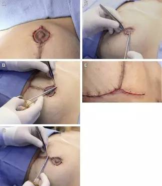 圖 3 A~E 示倒刺縫線應用于乳房縮小術及乳房提升固定術