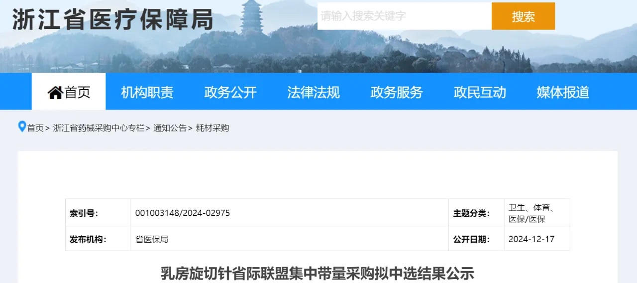 12月17日,浙江醫(yī)保局發(fā)布《乳房旋切針省際聯(lián)盟集中帶量采購(gòu)擬中選結(jié)果公示》。