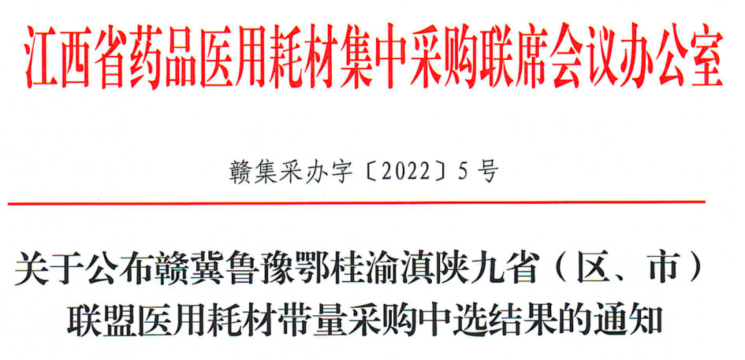 3月8日,江西省藥品醫用耗材集中采購聯席會議辦公室發布《關于公布贛冀魯豫鄂桂渝滇陜九省(區、市) 聯盟醫用耗材帶量采購中選結果的通知》(以下簡稱通知)。