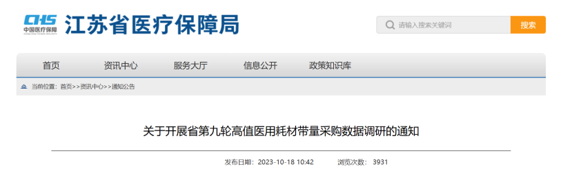10月18日,江蘇省醫(yī)保局發(fā)布《關(guān)于開展省第九輪高值醫(yī)用耗材帶量采購數(shù)據(jù)調(diào)研的通知》(以下簡稱《通知》)。