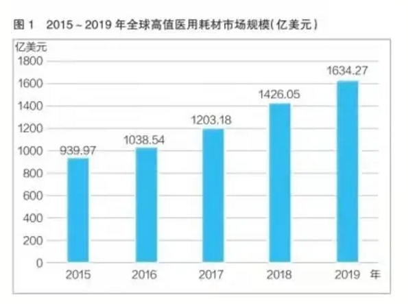 隨著醫療產業的高速發展,全球高值醫用耗材市場規模增長迅速。2019年,全球高值醫用耗材行業市場規模達1634.27億美元(見圖1),2015~2019年的年復合年增長率為14.83%。