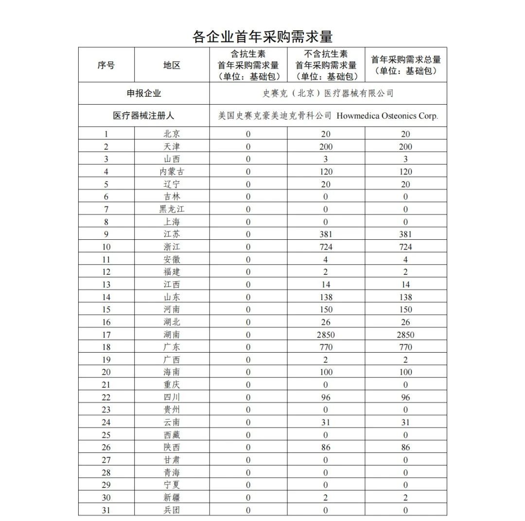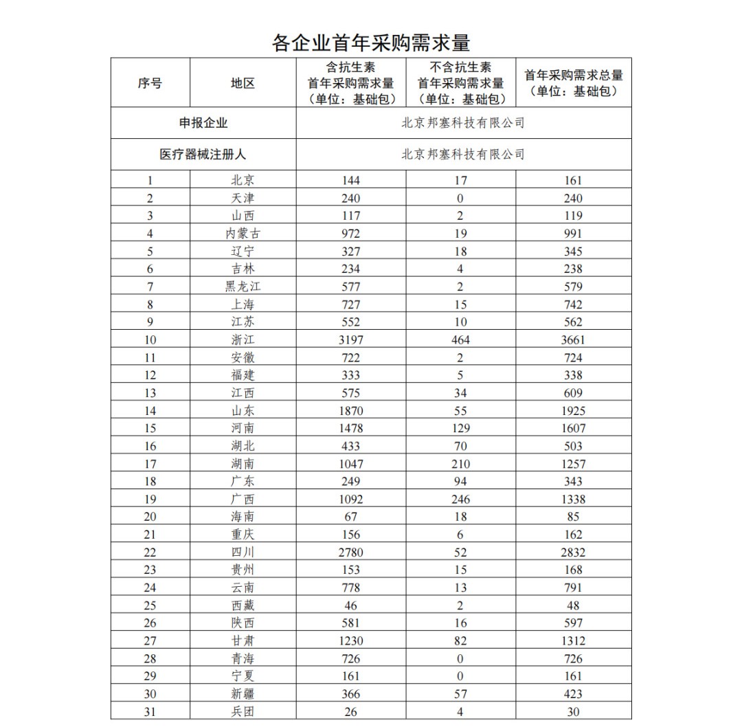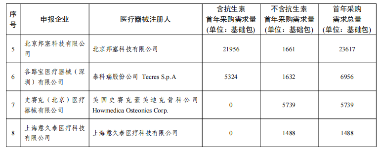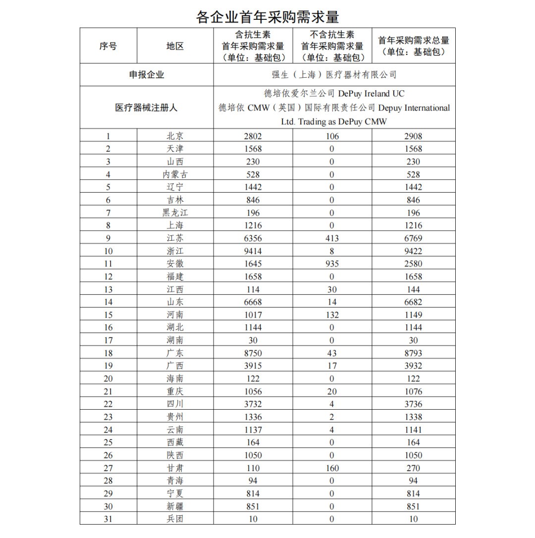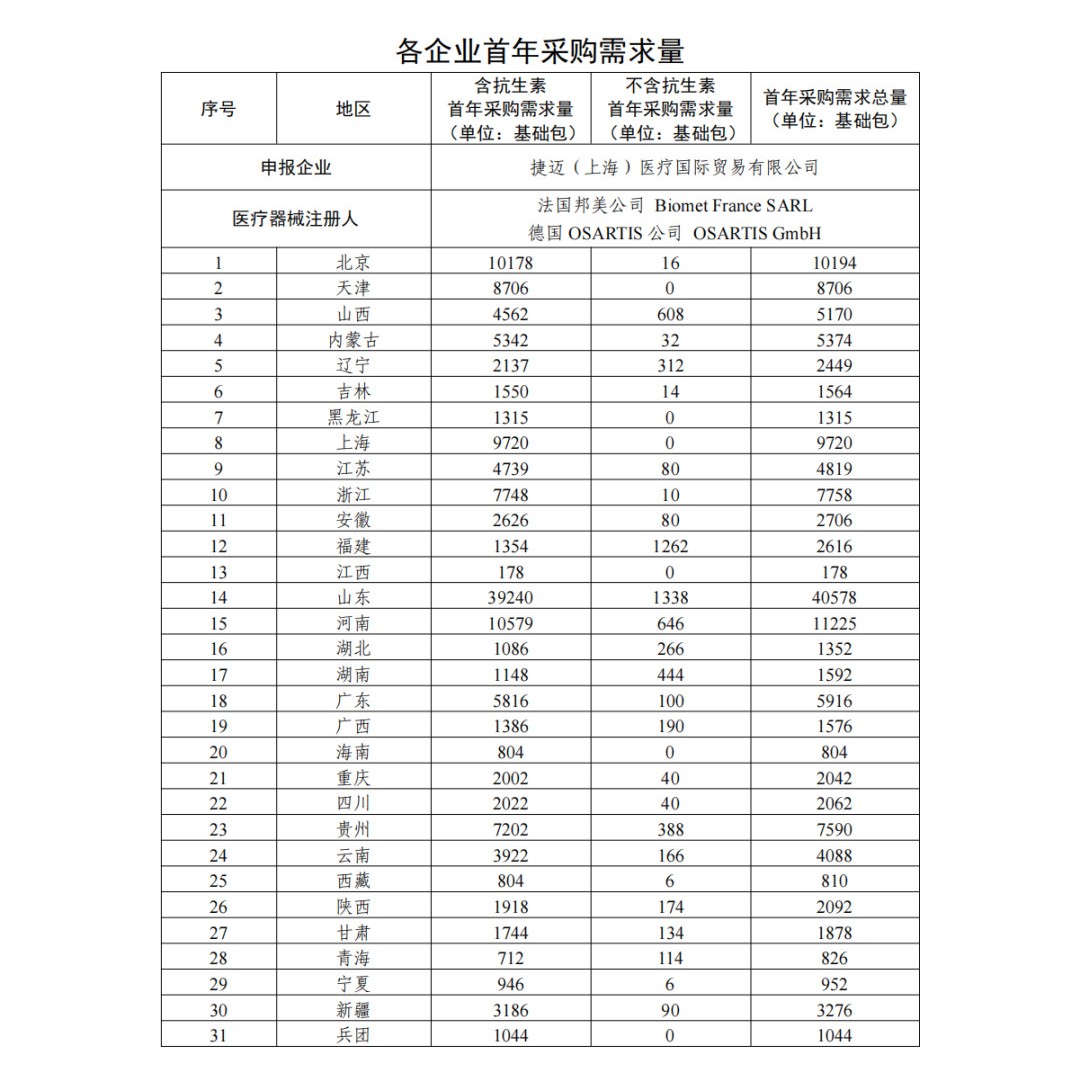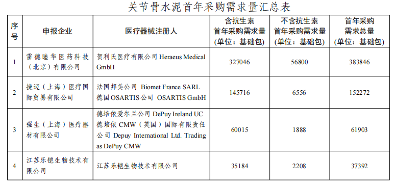 首年采購需求總量為673213個基礎(chǔ)包,其中關(guān)節(jié)骨水泥(含抗生素)需求總量為 595241 個基礎(chǔ)包,關(guān)節(jié)骨水泥(不含抗生素)需求總量為 77972 個基礎(chǔ)包。
