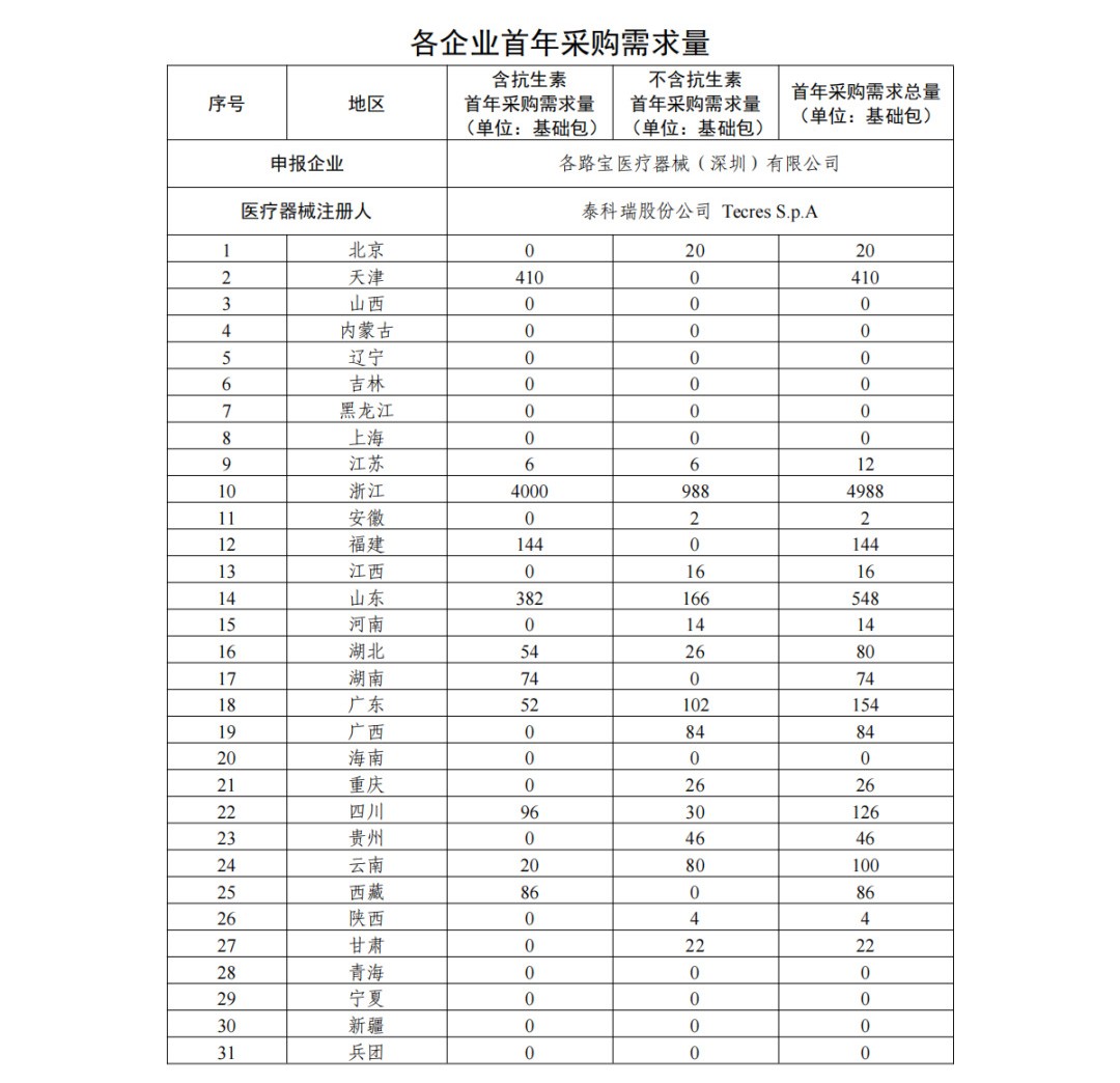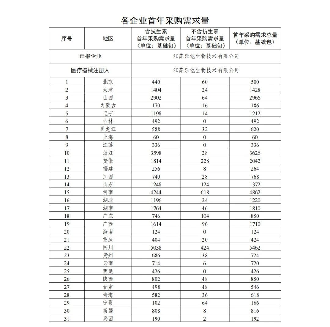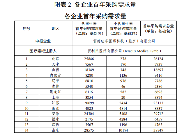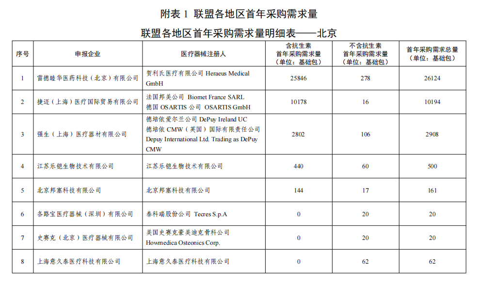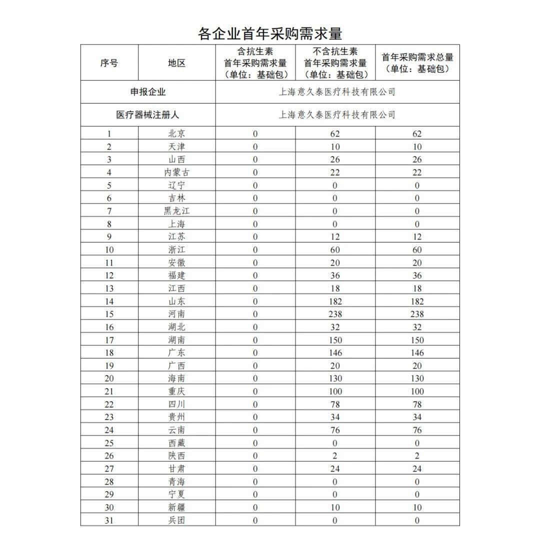 首年采購需求總量為673213個基礎(chǔ)包,其中關(guān)節(jié)骨水泥(含抗生素)需求總量為 595241 個基礎(chǔ)包,關(guān)節(jié)骨水泥(不含抗生素)需求總量為 77972 個基礎(chǔ)包。