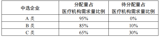 第一步:醫(yī)療機構(gòu)填報采購需求量的產(chǎn)品若在中選范圍,根據(jù)以下規(guī)則按比例分配采購需求量。申報企業(yè)按中選排名由低到高進行排序,排序前 40%(具體數(shù)量向上取整)的企業(yè)為A類,按采購需求量的95%分量;排序40%(具體數(shù)量向上取整再加1)至70%(具體數(shù)量向上取整)的企業(yè)為B類,按采購需求量的85%分量;其他中選企業(yè)為C類,按采購需求量的65%分量。