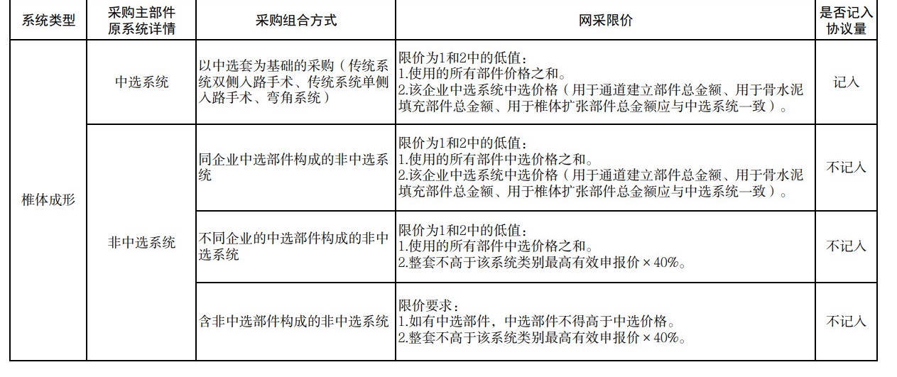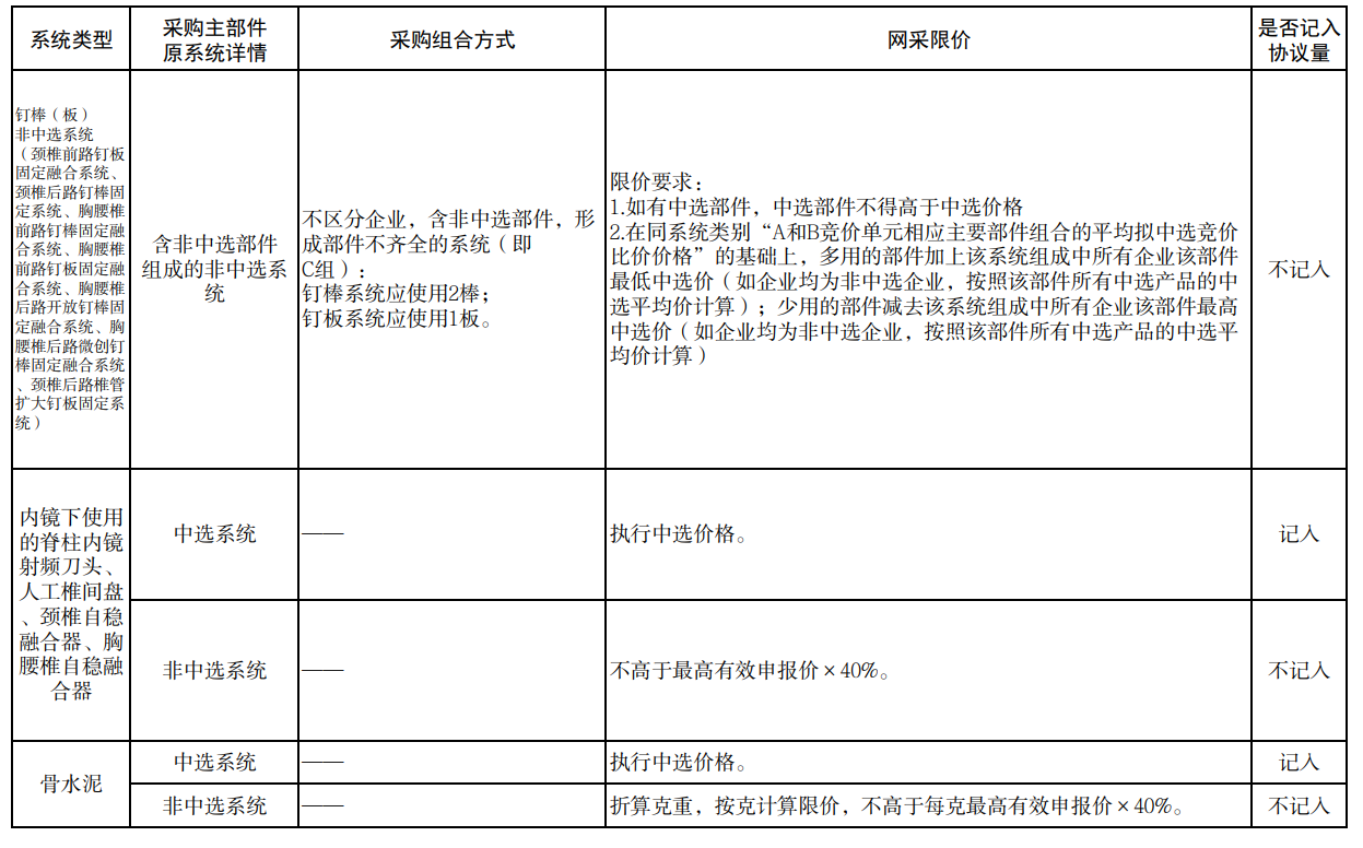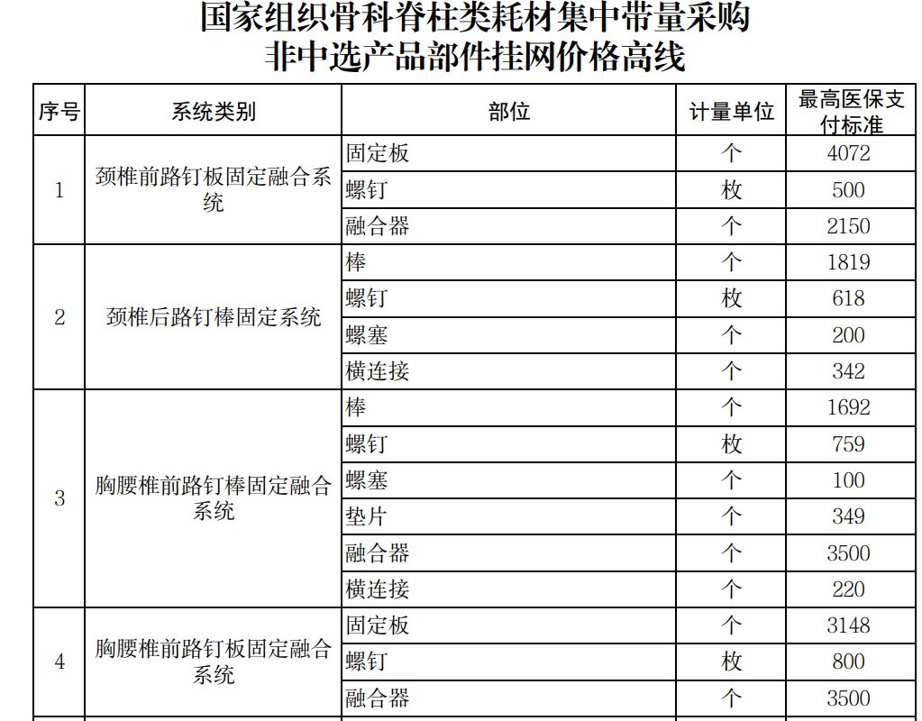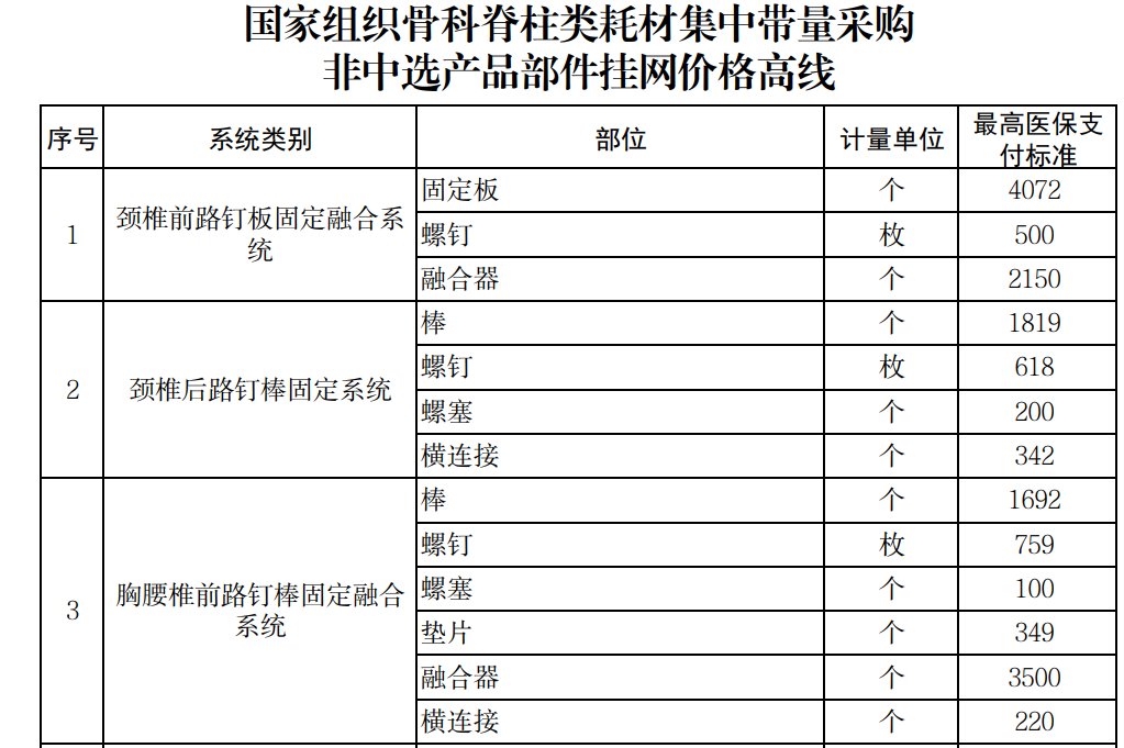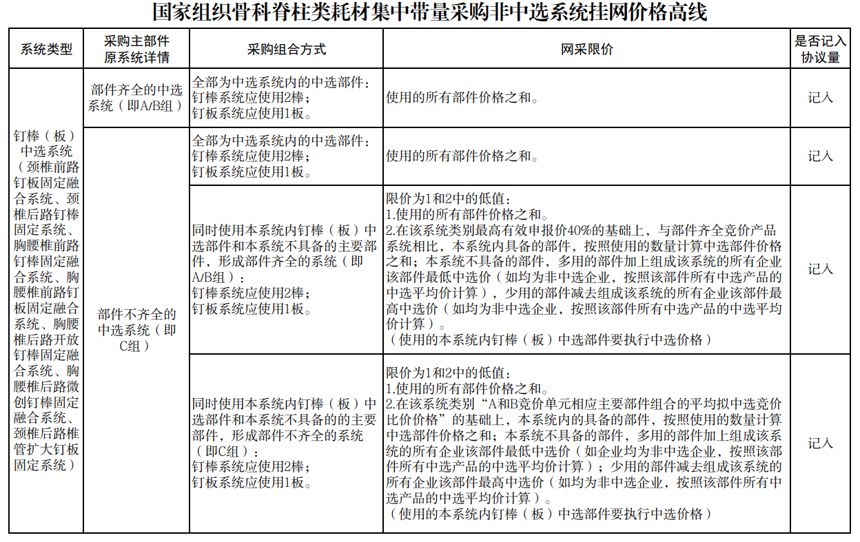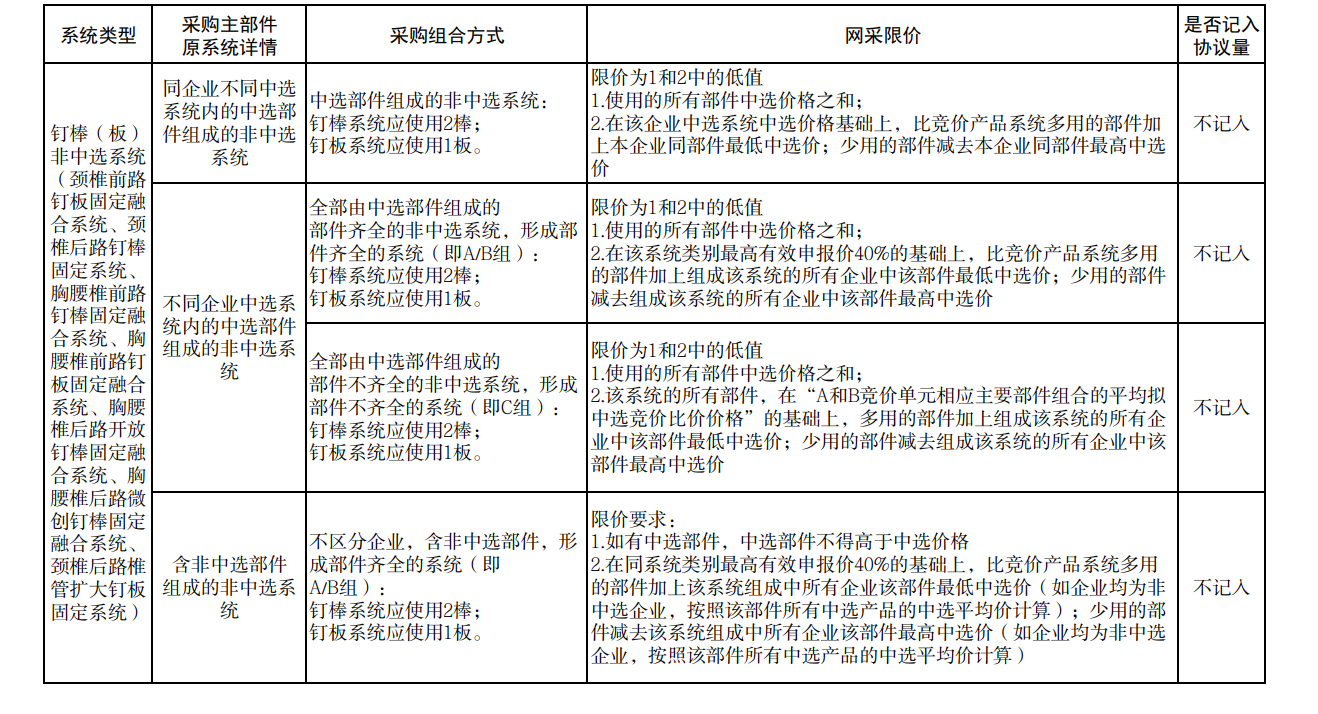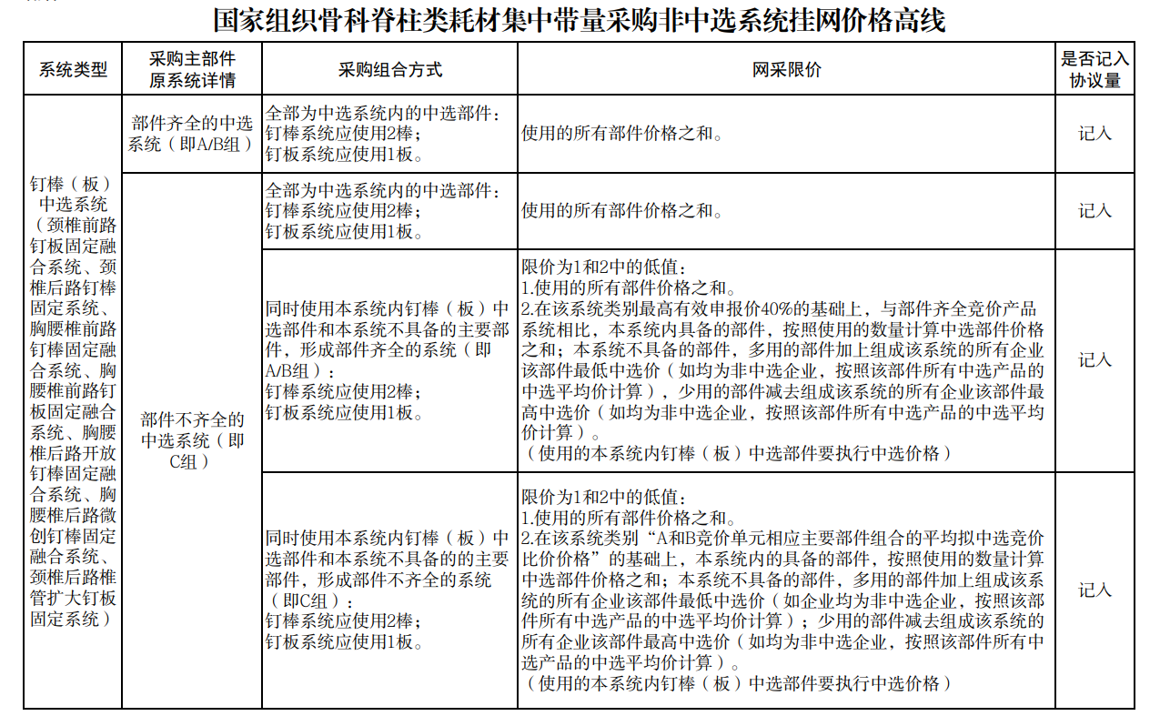 各中選企業(yè)的非中選產(chǎn)品系統(tǒng)中包含中選產(chǎn)品系統(tǒng)部件的,按不高于該部件的中選價格掛網(wǎng);如非中選脊柱產(chǎn)品各部件均由中選產(chǎn)品系統(tǒng)的不同部件組成,則總價按實(shí)際使用部件折算成中選產(chǎn)品系統(tǒng)價格后,不得高于同企業(yè)同類別中選產(chǎn)品價格。其他非中選產(chǎn)品系統(tǒng)及部件分別設(shè)定掛網(wǎng)價格高線。