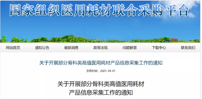 4月1日,國家組織醫(yī)用耗材聯合采購平臺發(fā)布《關于開展部分骨科類高值醫(yī)用耗材產品信息采集工作的通知》。