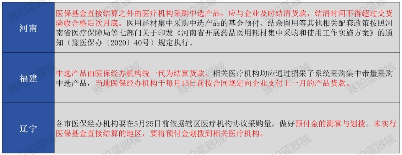 根據通知,中選產品由醫保經辦機構統一代為結算貨款。相關醫療機構均應通過招采子系統采購集中帶量采購中選產品,當地醫保經辦機構于每月15日前按合同規定向企業支付上一月的產品貨款。