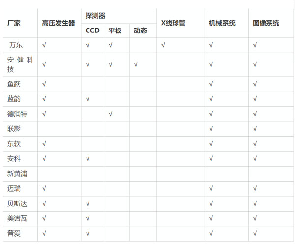 由此可見,國內(nèi)DR廠家在高壓發(fā)生器、機(jī)械系統(tǒng)以及圖像系統(tǒng)等幾個(gè)方面都具備自主研發(fā)生產(chǎn)的能力,但在探測器、X線球管等核心部件上自主研發(fā)能力比較欠缺,目前僅有萬東和安健科技在這方面有技術(shù)儲備。