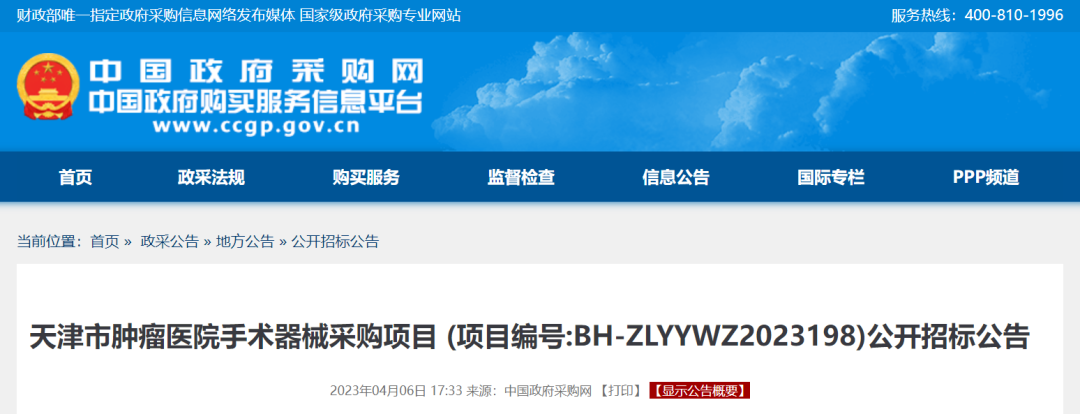 近日,中國政府采購網發布了“天津市腫瘤醫院手術器械采購項目”的招標公告。