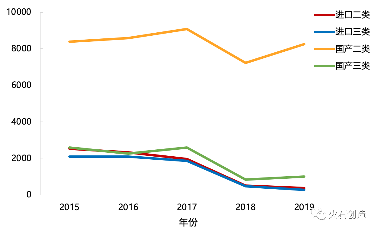 根據火石創造數據庫顯示,近五年二類器械國產與進口的獲批數量比較,國產器械獲批總數占比超84%,按照國家分類目錄進行對比,在中低端市場,再次說明國產器械基本都實現了替代及完全替代,且保持明顯優勢。主要原因是中低端市場門檻低、投入小,加上自身優勢,如勞動力成本低、產品性價比高、政策利好發展、市場需求持續增長等,都使我國在中低端市場占據明顯優勢。