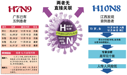 中國疾病預(yù)防控制中心、江西省疾控中心等機(jī)構(gòu)的研究人員報告說,去年11月30日,江西省南昌市一名73歲女性因發(fā)燒入院治療,之后出現(xiàn)多器官功能衰竭,于12月6日死亡。這名女子在發(fā)病前4天曾去過活禽市場。研究人員在該病例的化驗樣本中檢測出甲型流感病毒,并進(jìn)一步確定為新型H10N8禽流感病毒。